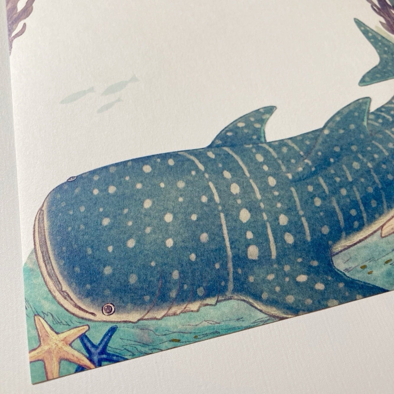 フィリピンの海で出会ったジンベエザメと、その周りを泳ぐ光る小魚、寄り添うコバンザメ――そんな情景を思い出に込めたデザインです。手紙を広げたときに、小さな旅の風景がよみがえるよう願っております。