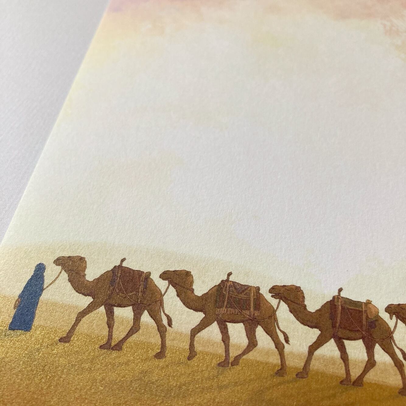 砂漠に沈む大きな太陽、案内の青年とラクダたち――旅で出会った情景を紙の上に閉じ込めています。大切な方への手紙を包むとき、遠い異国の空気を少しでも感じていただけましたら幸いです。