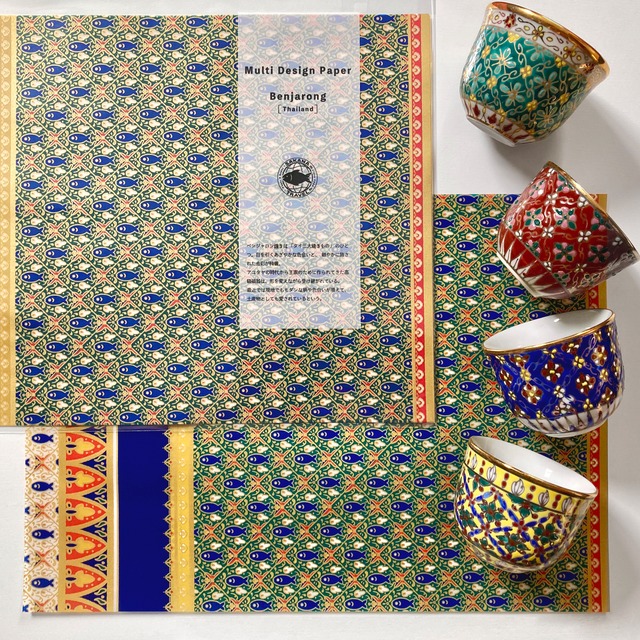 タイの三大焼き物のひとつ、ベンジャロン焼きの華やかな文様から着想を得て、魚をモチーフに仕上げたオリジナルのデザインペーパーです。 鮮やかな色彩をそのままに、縁を彩る特徴的な金彩は特色の金インクで表現し、煌びやかな輝きをまとわせました。 つるりとしたクラシコトレーシングの質感は、透け感と光沢がありながら手に馴染みやすく、ブックカバーにしても心地よくお使いいただけます。 コラージュやラッピング、手紙のアレンジなど、自由な発想でお楽しみください! 仕様 ・サイズ:A4 ・内容:同柄4枚入 ・紙質:クラシコトレーシング ・印刷:フルカラー+金インク エキゾチックな図案と金のきらめきが、日常のなかに小さな旅のような彩りを添えてくれる一枚です。 ※ブックカバーには、文庫本サイズ程度までがおすすめです。 ※写真の食器や文庫本は撮影用の小物であり、商品には含まれません。